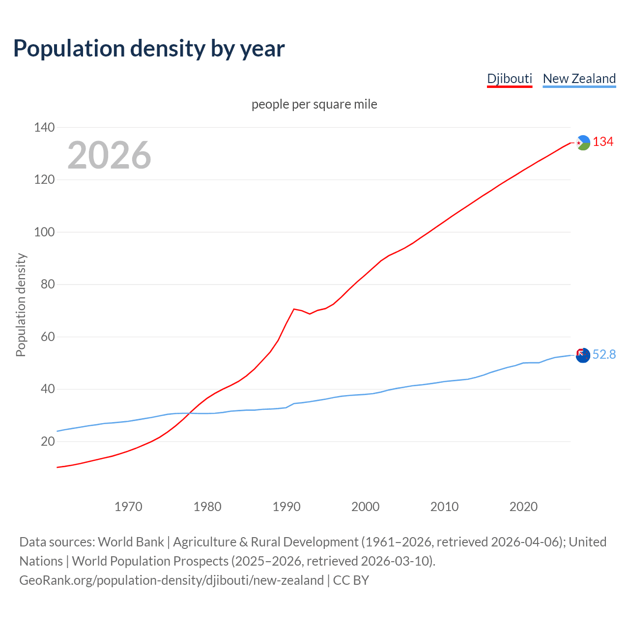 From 2006 to 2026, population density in Djibouti increased by 40.2%, compared to a 28.2% growth in New Zealand.