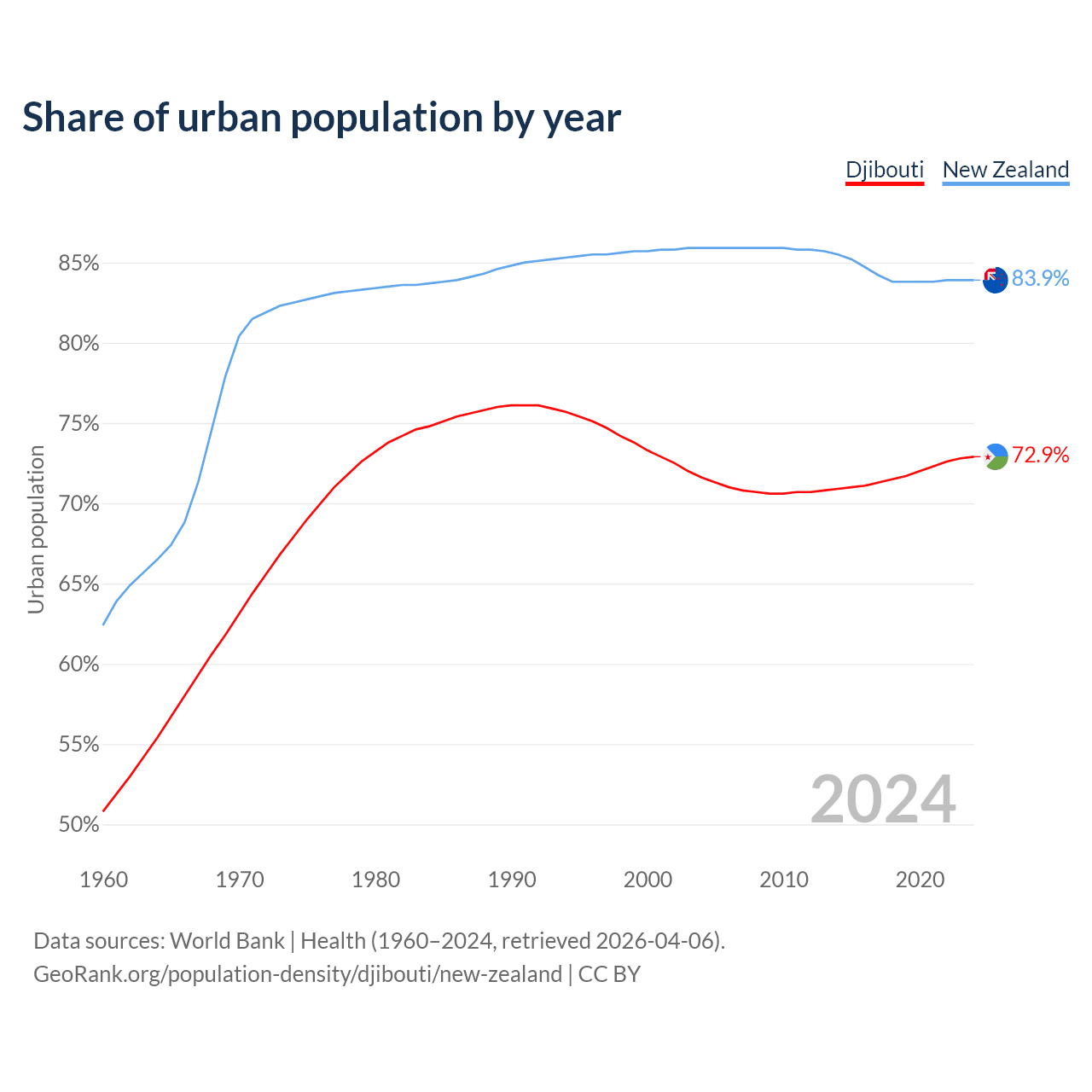 From 2004 to 2024, the share of urban population changed from 71.6% to 72.9% in Djibouti and from 85.9% to 83.9% in New Zealand.