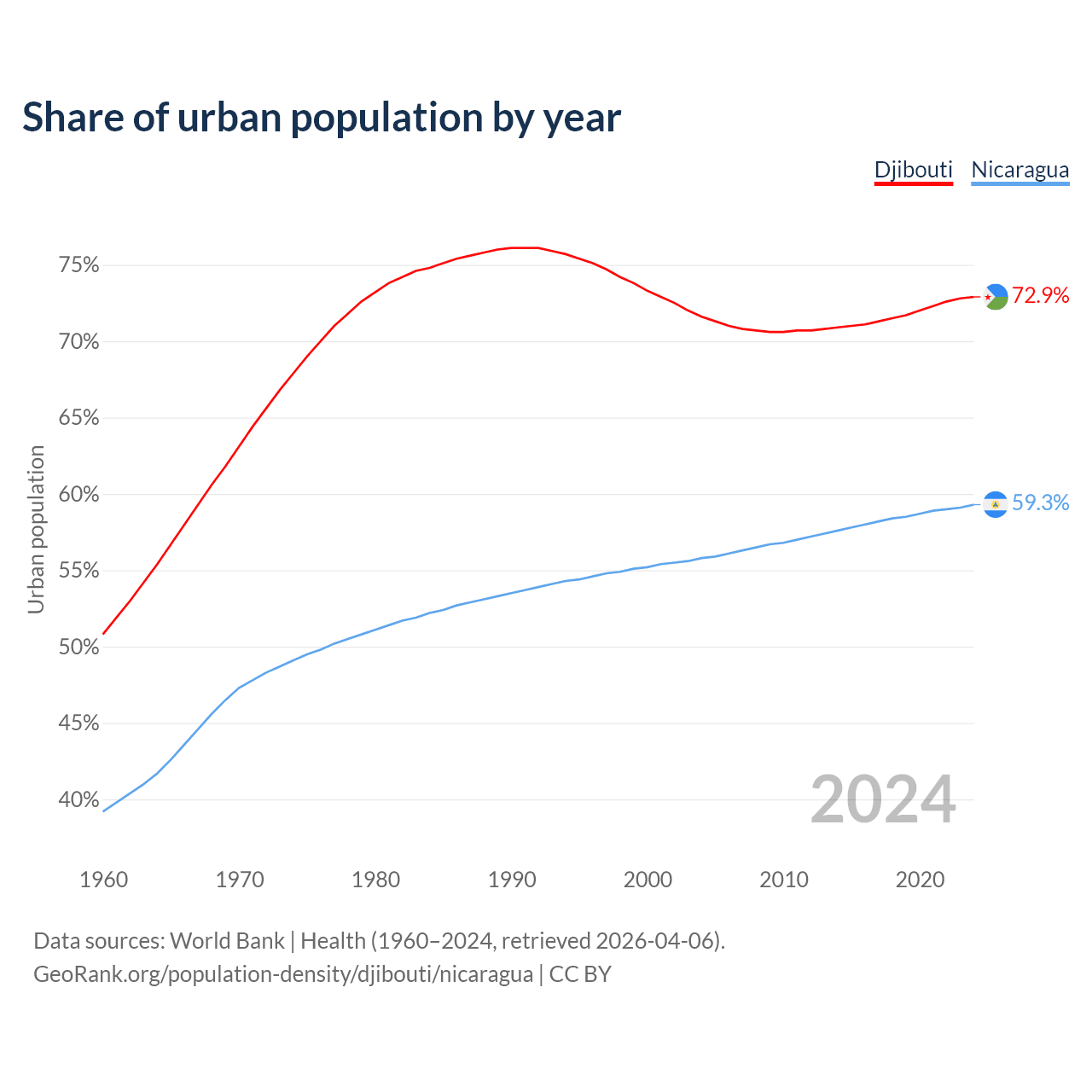 From 2004 to 2024, the share of urban population changed from 71.6% to 72.9% in Djibouti and from 55.8% to 59.3% in Nicaragua.