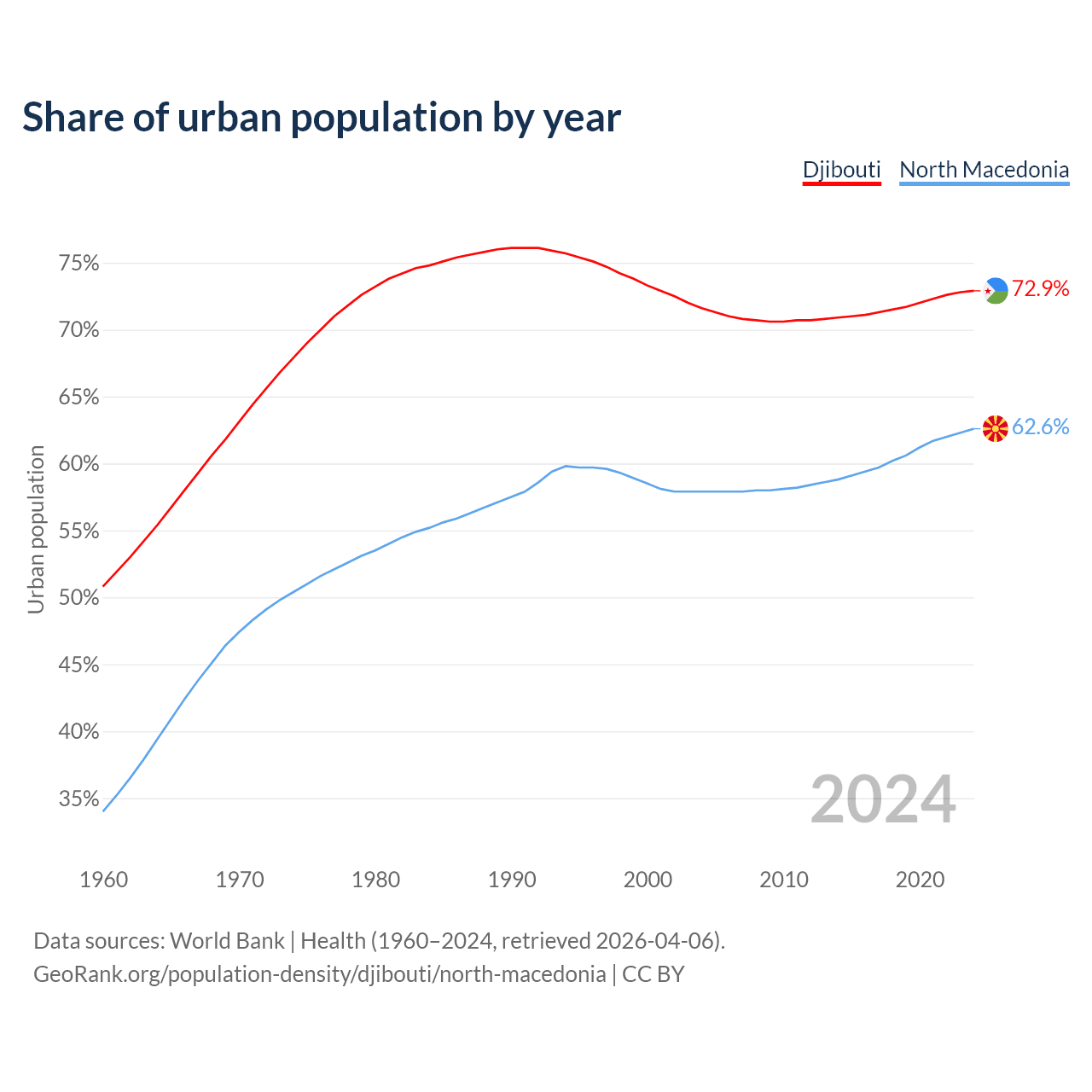 From 2004 to 2024, the share of urban population changed from 71.6% to 72.9% in Djibouti and from 57.9% to 62.6% in North Macedonia.