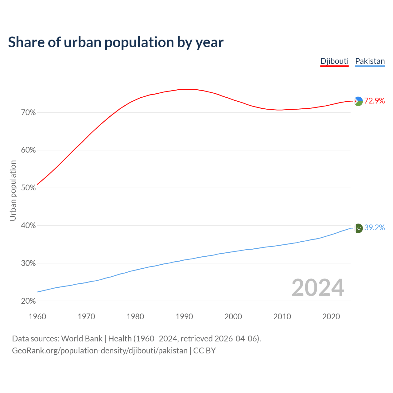 From 2004 to 2024, the share of urban population changed from 71.6% to 72.9% in Djibouti and from 33.7% to 39.2% in Pakistan.