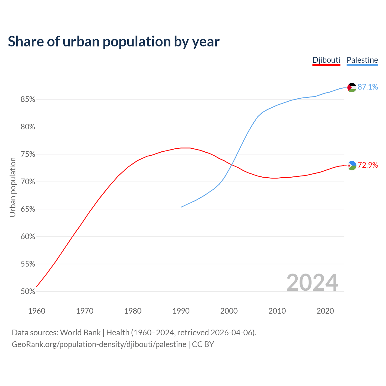 From 2004 to 2024, the share of urban population changed from 71.6% to 72.9% in Djibouti and from 79% to 87.1% in Palestine.
