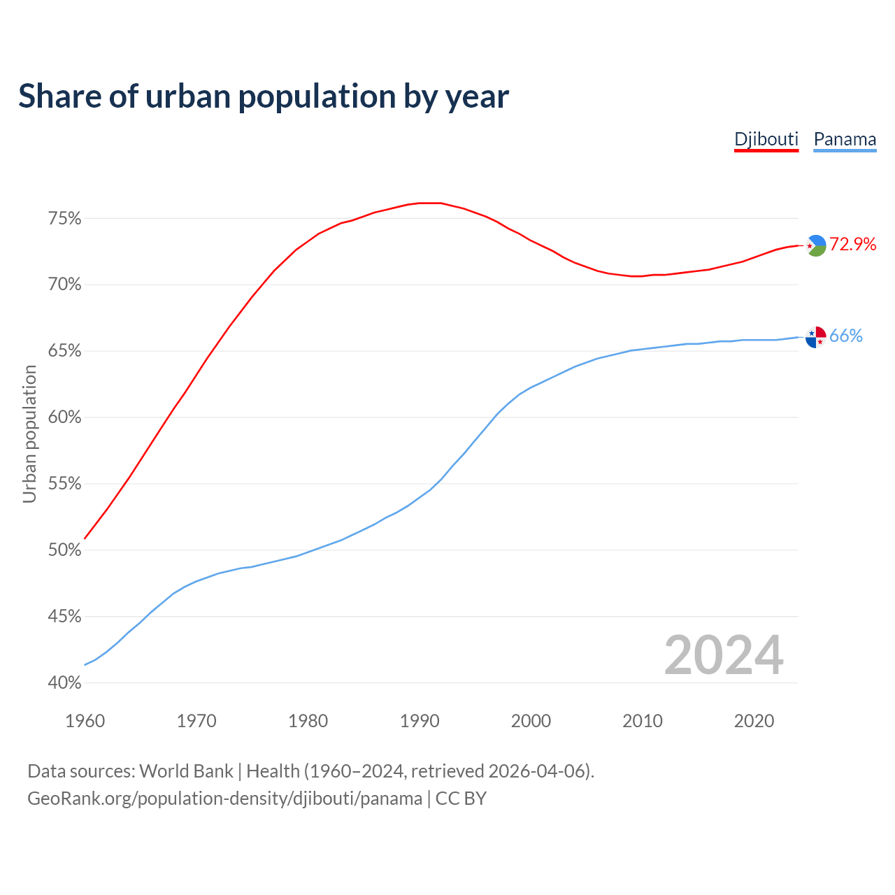 From 2004 to 2024, the share of urban population changed from 71.6% to 72.9% in Djibouti and from 63.8% to 66% in Panama.