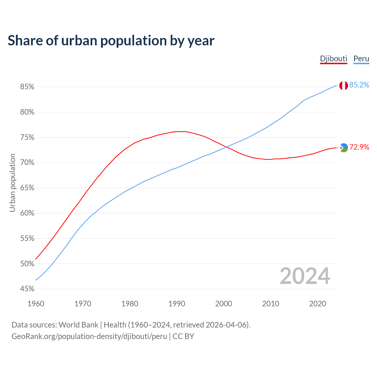 From 2004 to 2024, the share of urban population changed from 71.6% to 72.9% in Djibouti and from 74.4% to 85.2% in Peru.