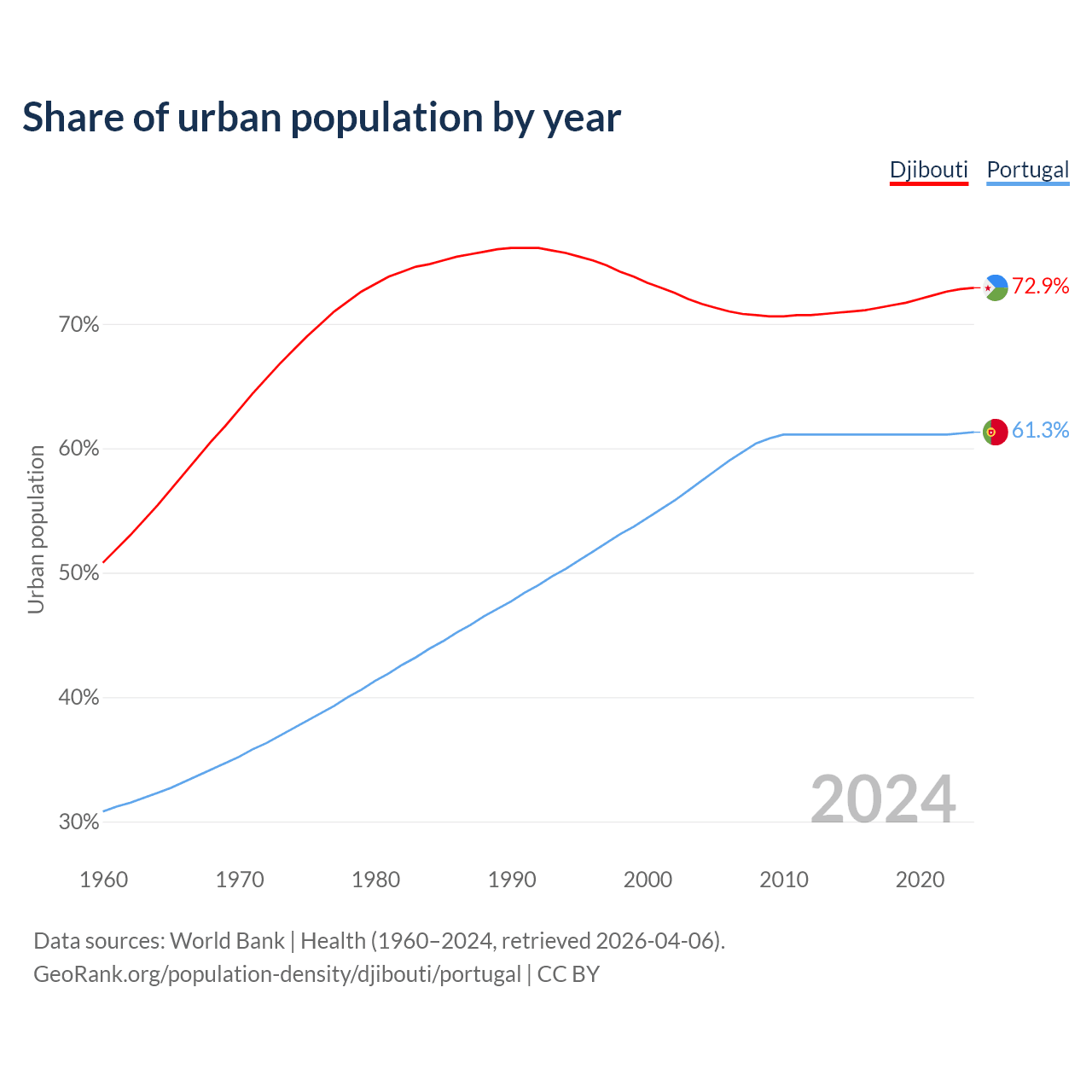From 2004 to 2024, the share of urban population changed from 71.6% to 72.9% in Djibouti and from 57.4% to 61.3% in Portugal.