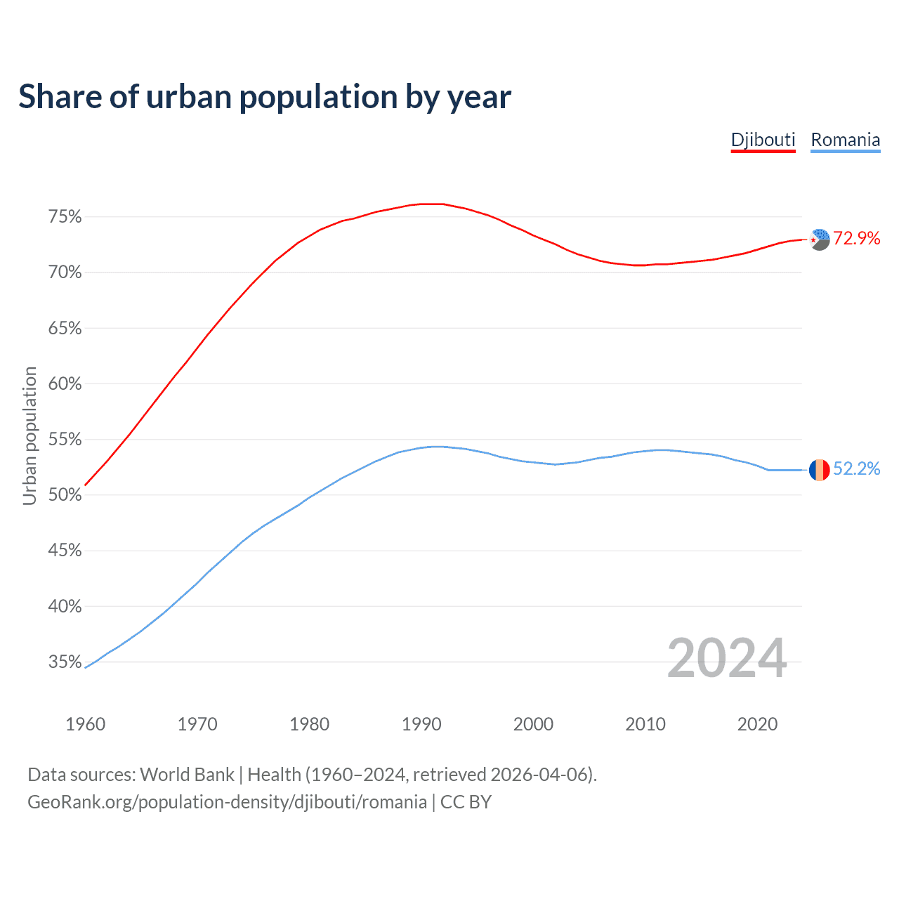 From 2004 to 2024, the share of urban population changed from 71.6% to 72.9% in Djibouti and from 52.9% to 52.2% in Romania.