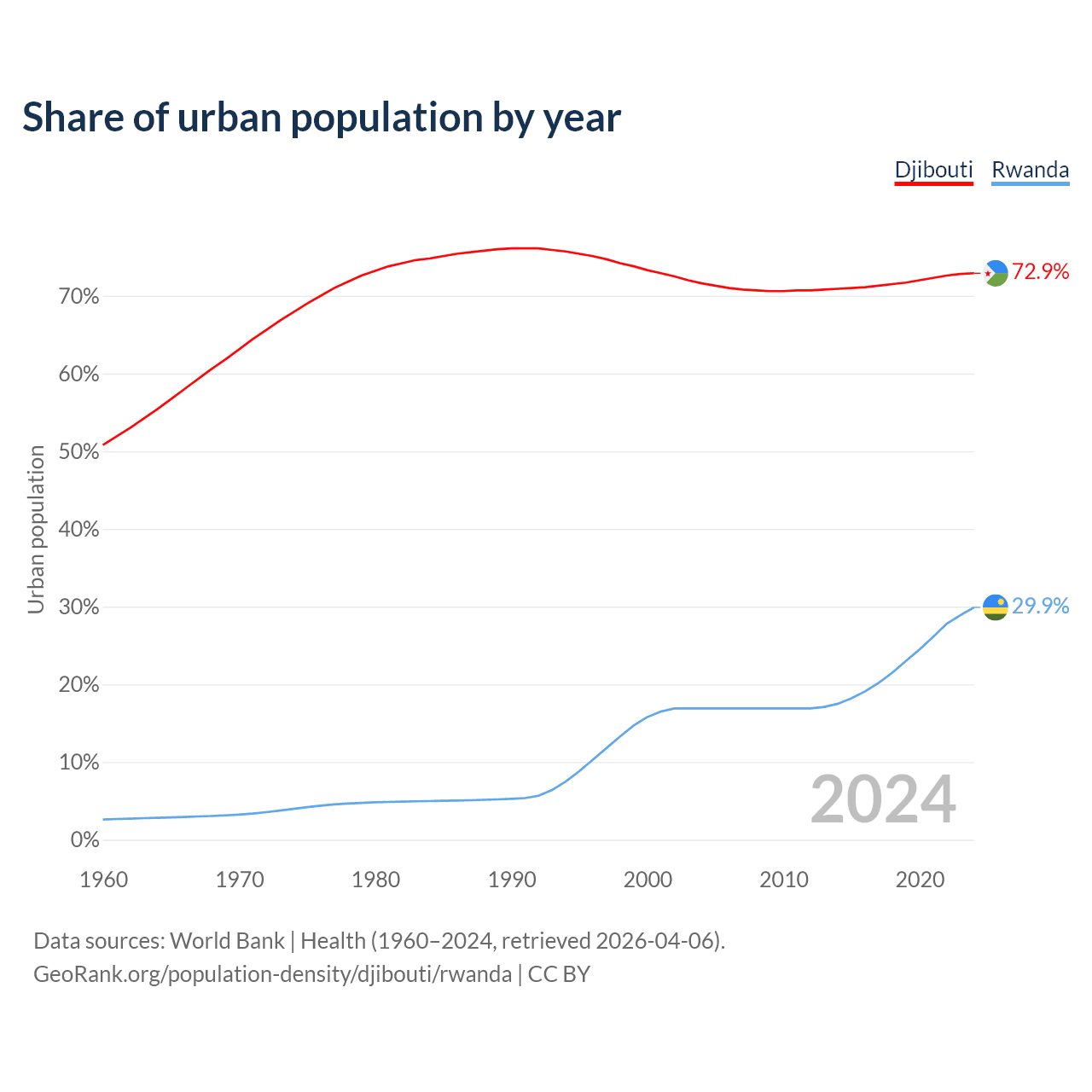 From 2004 to 2024, the share of urban population changed from 71.6% to 72.9% in Djibouti and from 16.9% to 29.9% in Rwanda.