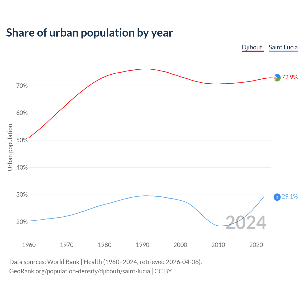 From 2004 to 2024, the share of urban population changed from 71.6% to 72.9% in Djibouti and from 24.8% to 29.1% in Saint Lucia.