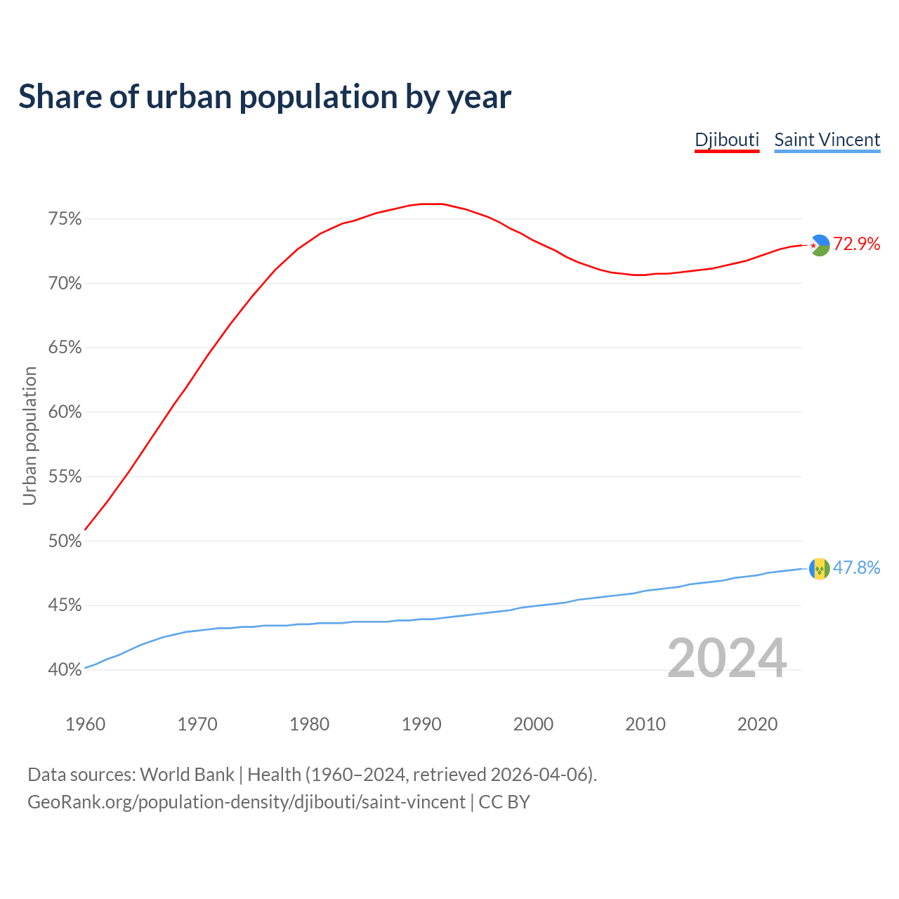 From 2004 to 2024, the share of urban population changed from 71.6% to 72.9% in Djibouti and from 45.4% to 47.8% in Saint Vincent.