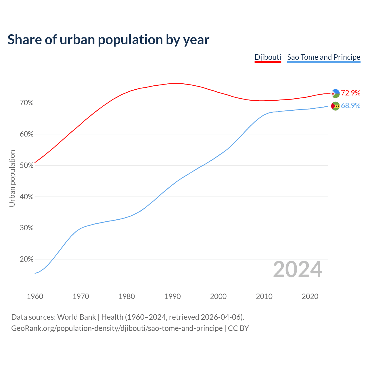 From 2004 to 2024, the share of urban population changed from 71.6% to 72.9% in Djibouti and from 57.9% to 68.9% in Sao Tome and Principe.