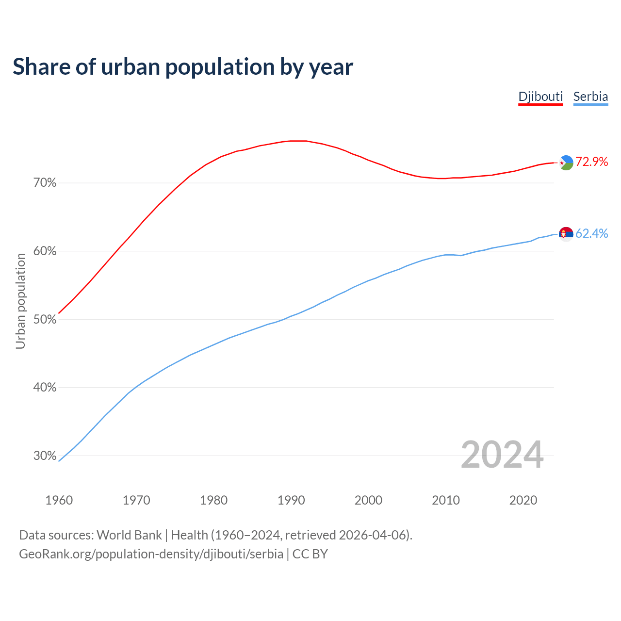 From 2004 to 2024, the share of urban population changed from 71.6% to 72.9% in Djibouti and from 57.3% to 62.4% in Serbia.