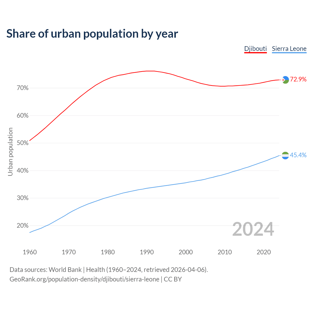 From 2004 to 2024, the share of urban population changed from 71.6% to 72.9% in Djibouti and from 36.5% to 45.4% in Sierra Leone.