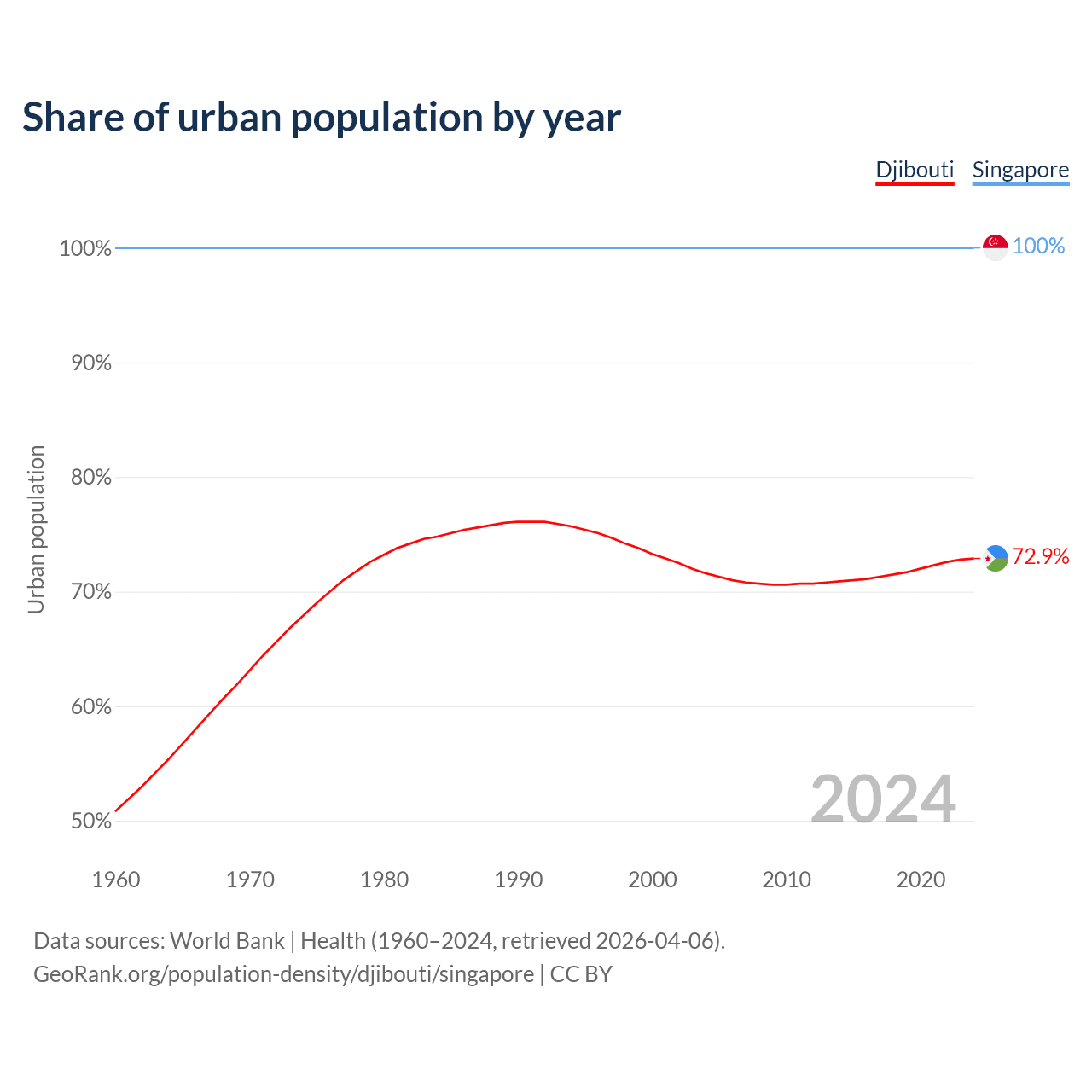 From 2004 to 2024, the share of urban population changed from 71.6% to 72.9% in Djibouti and from 100% to 100% in Singapore.