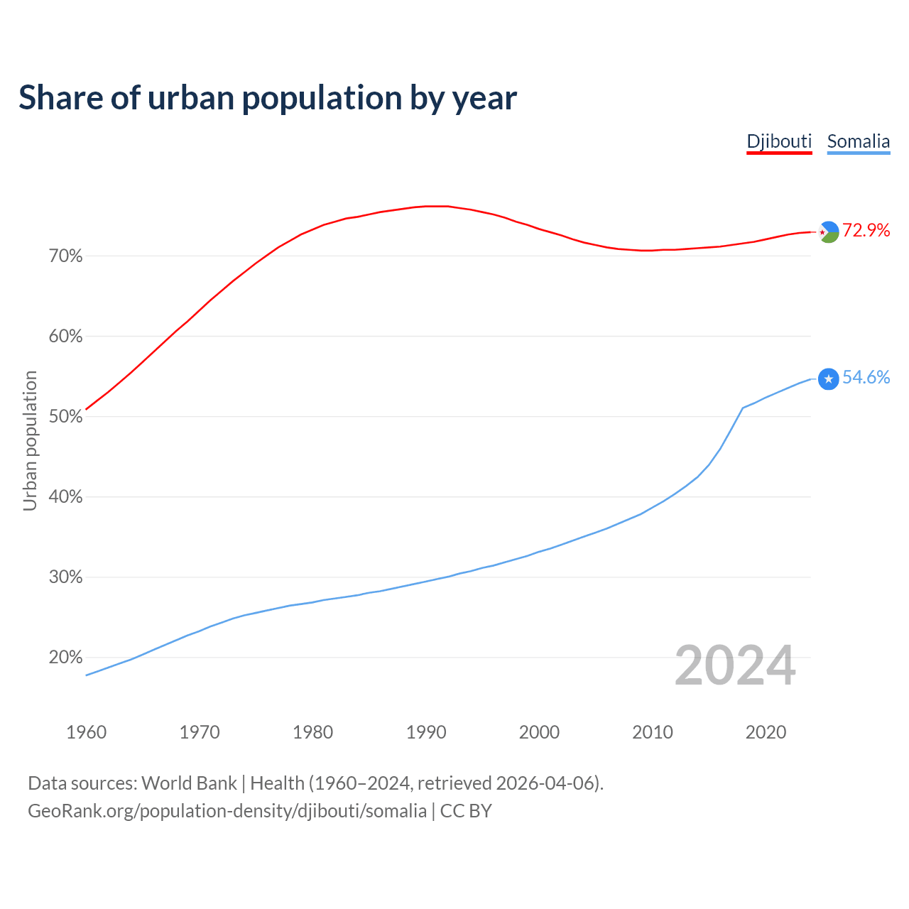 From 2004 to 2024, the share of urban population changed from 71.6% to 72.9% in Djibouti and from 35% to 54.6% in Somalia.