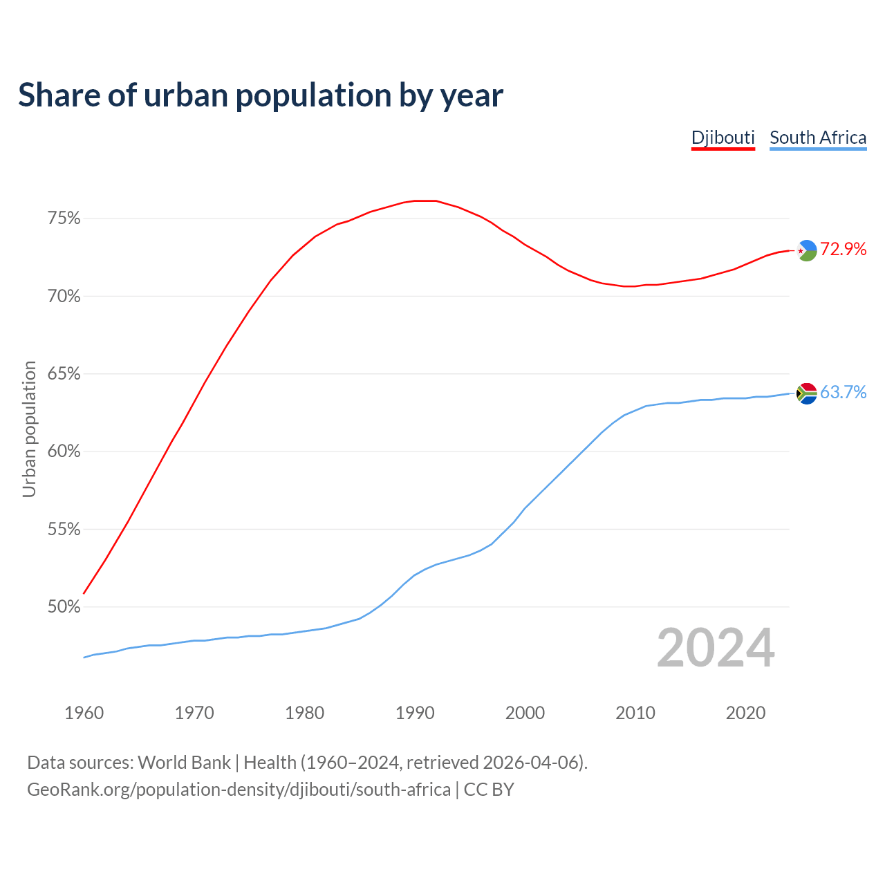 From 2004 to 2024, the share of urban population changed from 71.6% to 72.9% in Djibouti and from 59.1% to 63.7% in South Africa.