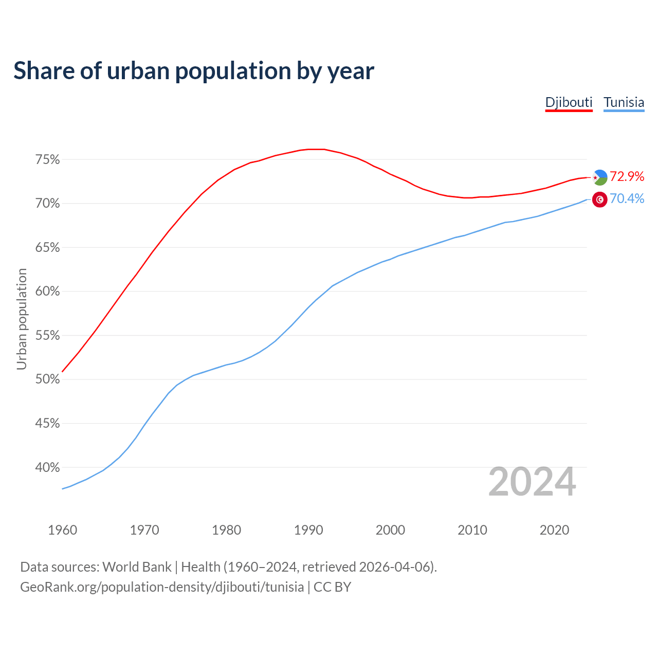 From 2004 to 2024, the share of urban population changed from 71.6% to 72.9% in Djibouti and from 64.9% to 70.4% in Tunisia.