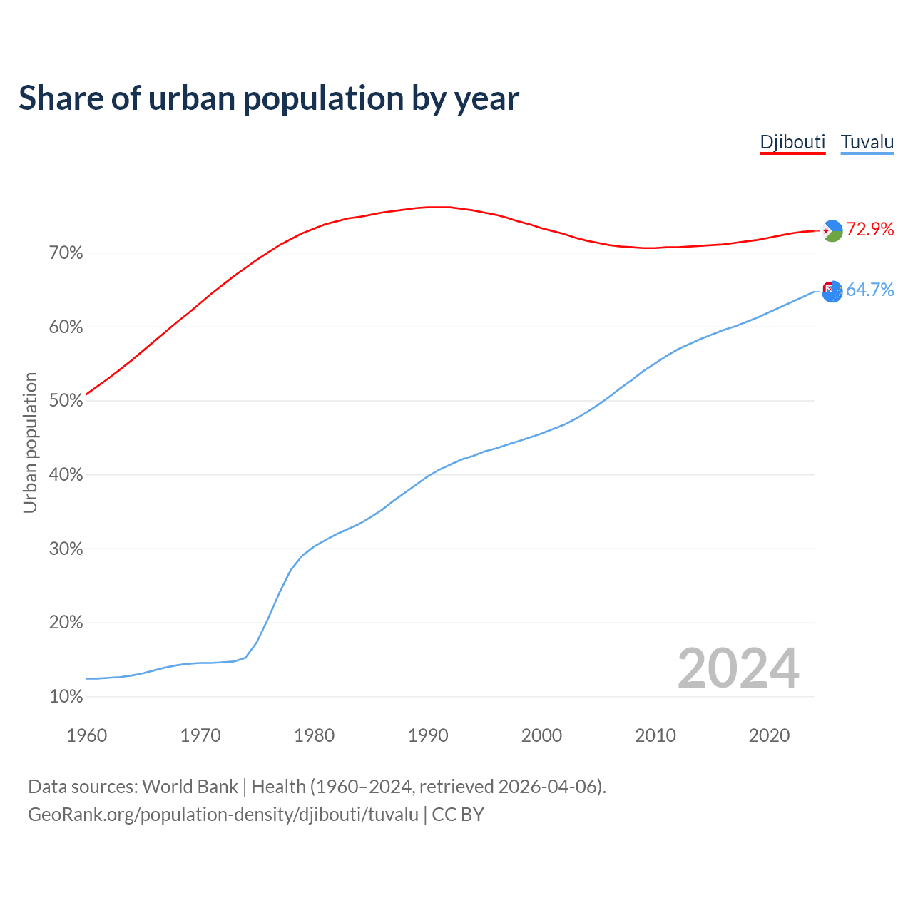 From 2004 to 2024, the share of urban population changed from 71.6% to 72.9% in Djibouti and from 48.4% to 64.7% in Tuvalu.