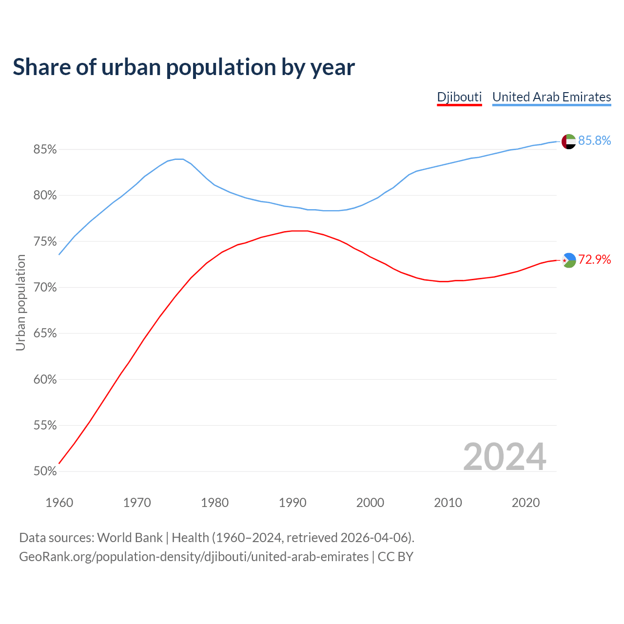 From 2004 to 2024, the share of urban population changed from 71.6% to 72.9% in Djibouti and from 81.5% to 85.8% in the United Arab Emirates.