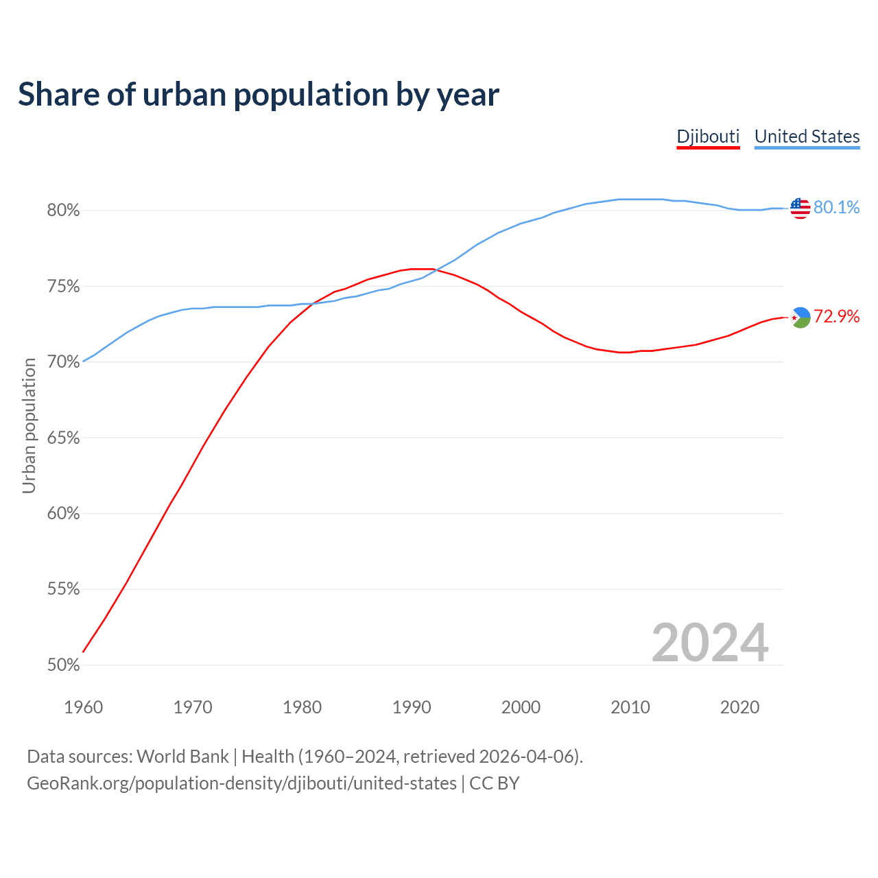 From 2004 to 2024, the share of urban population changed from 71.6% to 72.9% in Djibouti and from 80% to 80.1% in the United States.