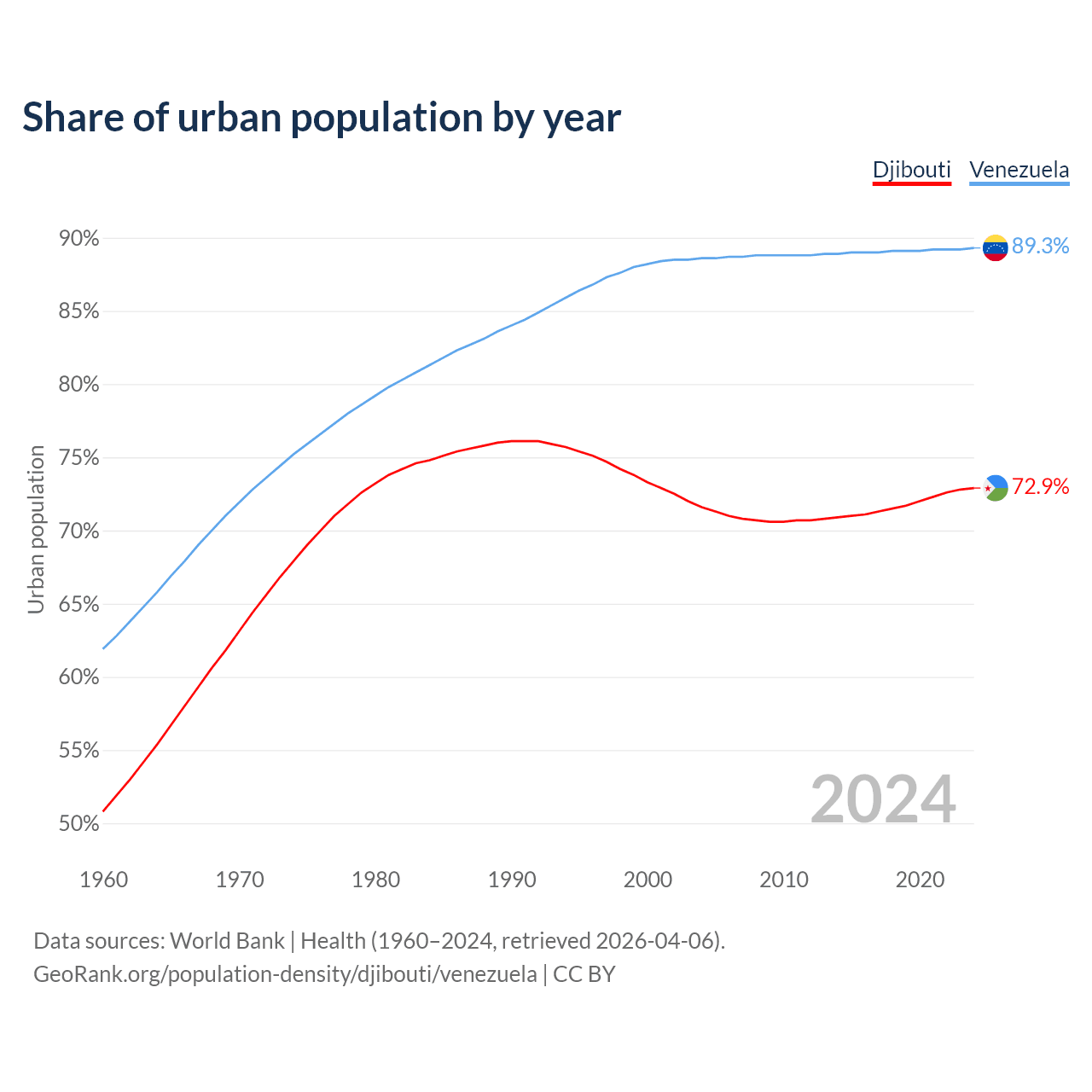 From 2004 to 2024, the share of urban population changed from 71.6% to 72.9% in Djibouti and from 88.6% to 89.3% in Venezuela.