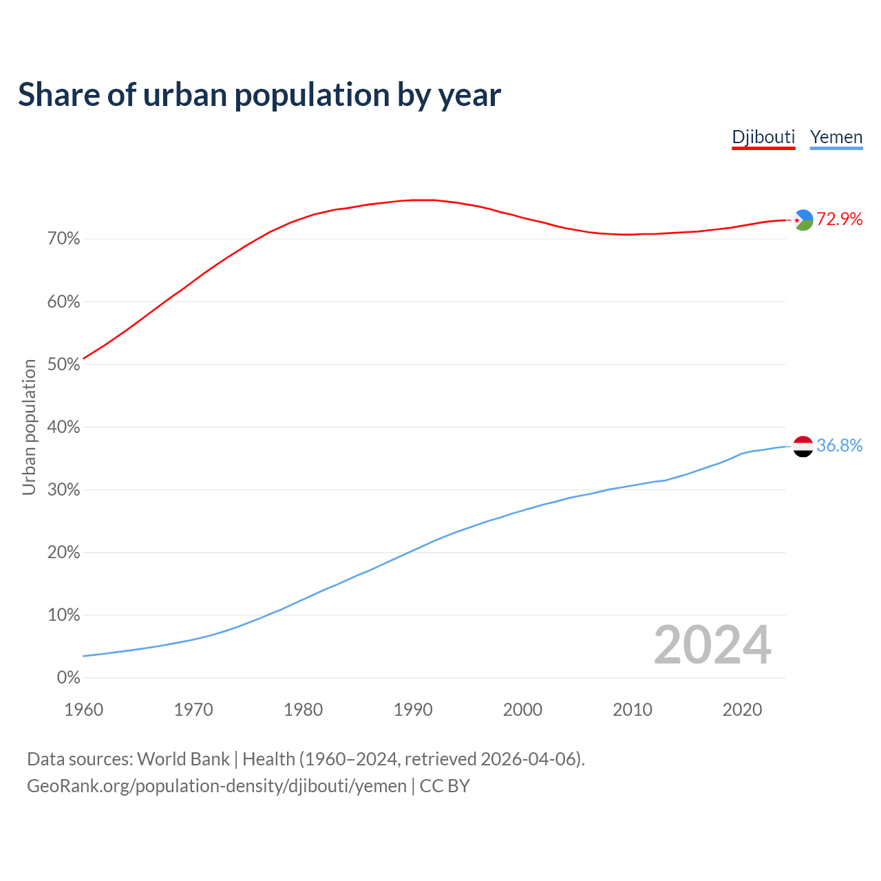 From 2004 to 2024, the share of urban population changed from 71.6% to 72.9% in Djibouti and from 28.5% to 36.8% in Yemen.