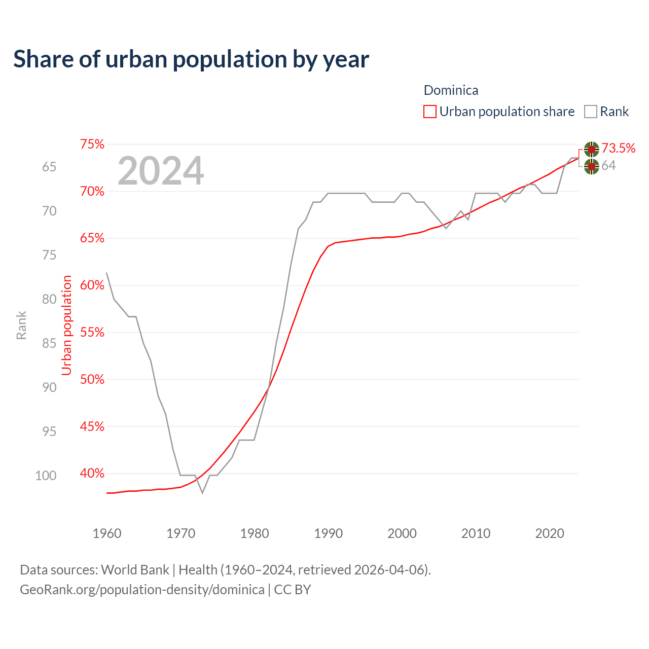This chart shows the share of urban population in Dominica from 1960 to 2024: 37.9% lived in urban areas in 1960, 65.2% in 2000, and 73.5% in 2024.