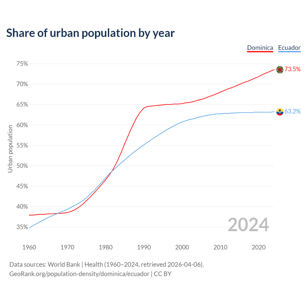 From 2004 to 2024, the share of urban population changed from 66% to 73.5% in Dominica and from 61.8% to 63.2% in Ecuador.