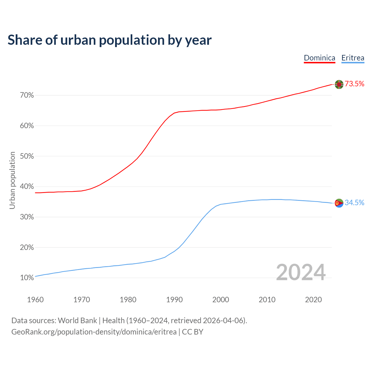 From 2004 to 2024, the share of urban population changed from 66% to 73.5% in Dominica and from 34.9% to 34.5% in Eritrea.