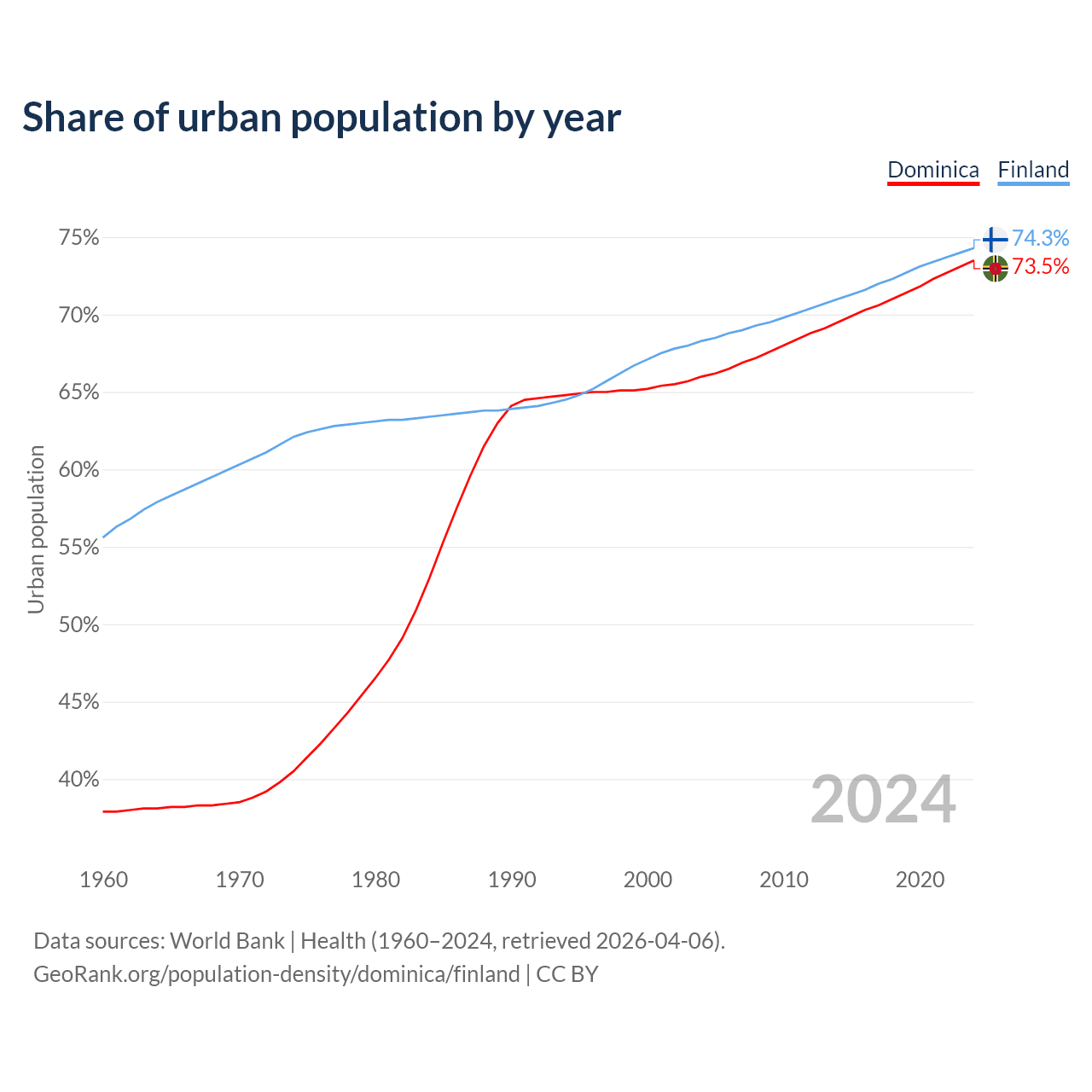 From 2004 to 2024, the share of urban population changed from 66% to 73.5% in Dominica and from 68.3% to 74.3% in Finland.