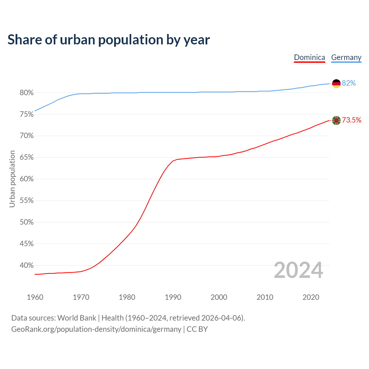 From 2004 to 2024, the share of urban population changed from 66% to 73.5% in Dominica and from 80.2% to 82% in Germany.