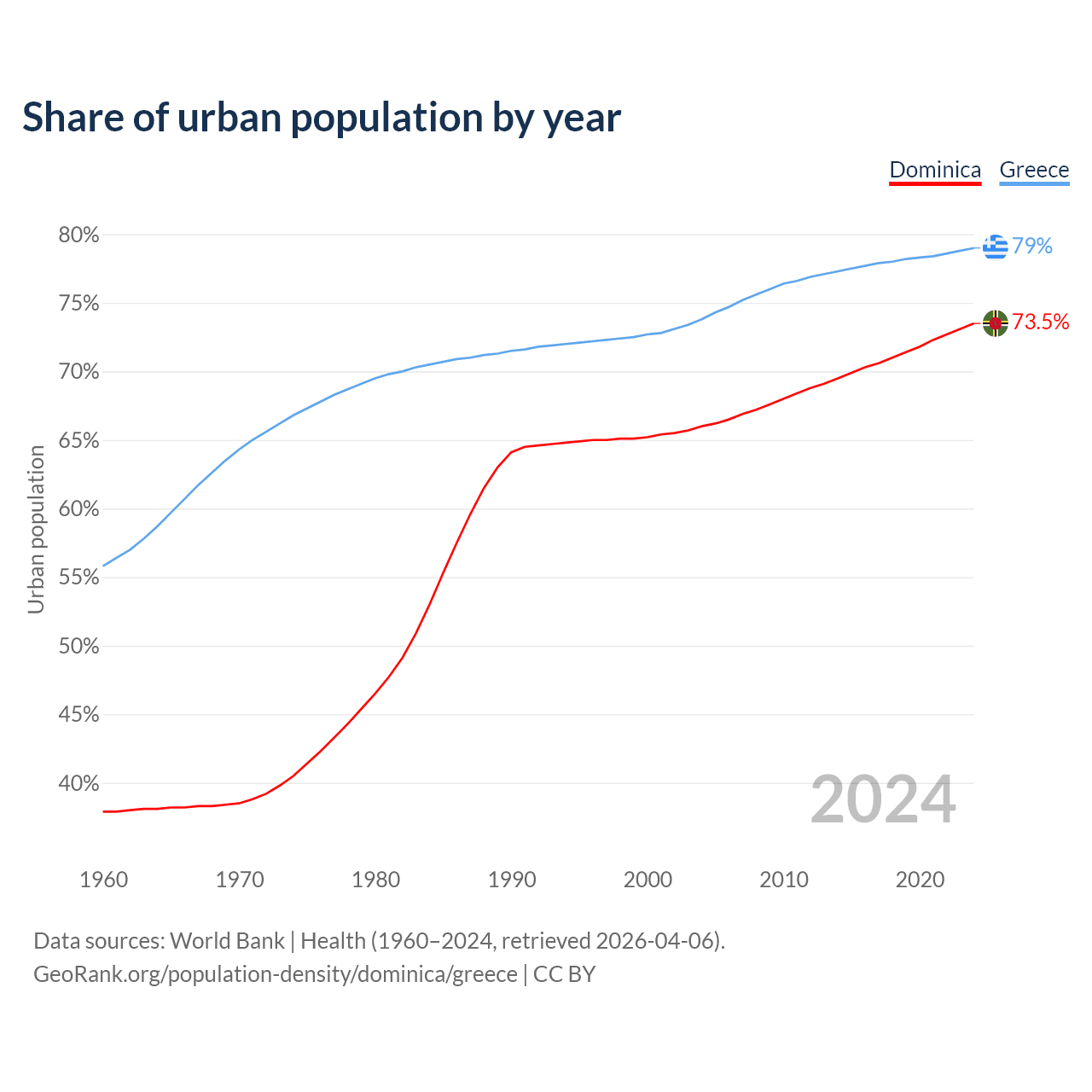 From 2004 to 2024, the share of urban population changed from 66% to 73.5% in Dominica and from 73.8% to 79% in Greece.