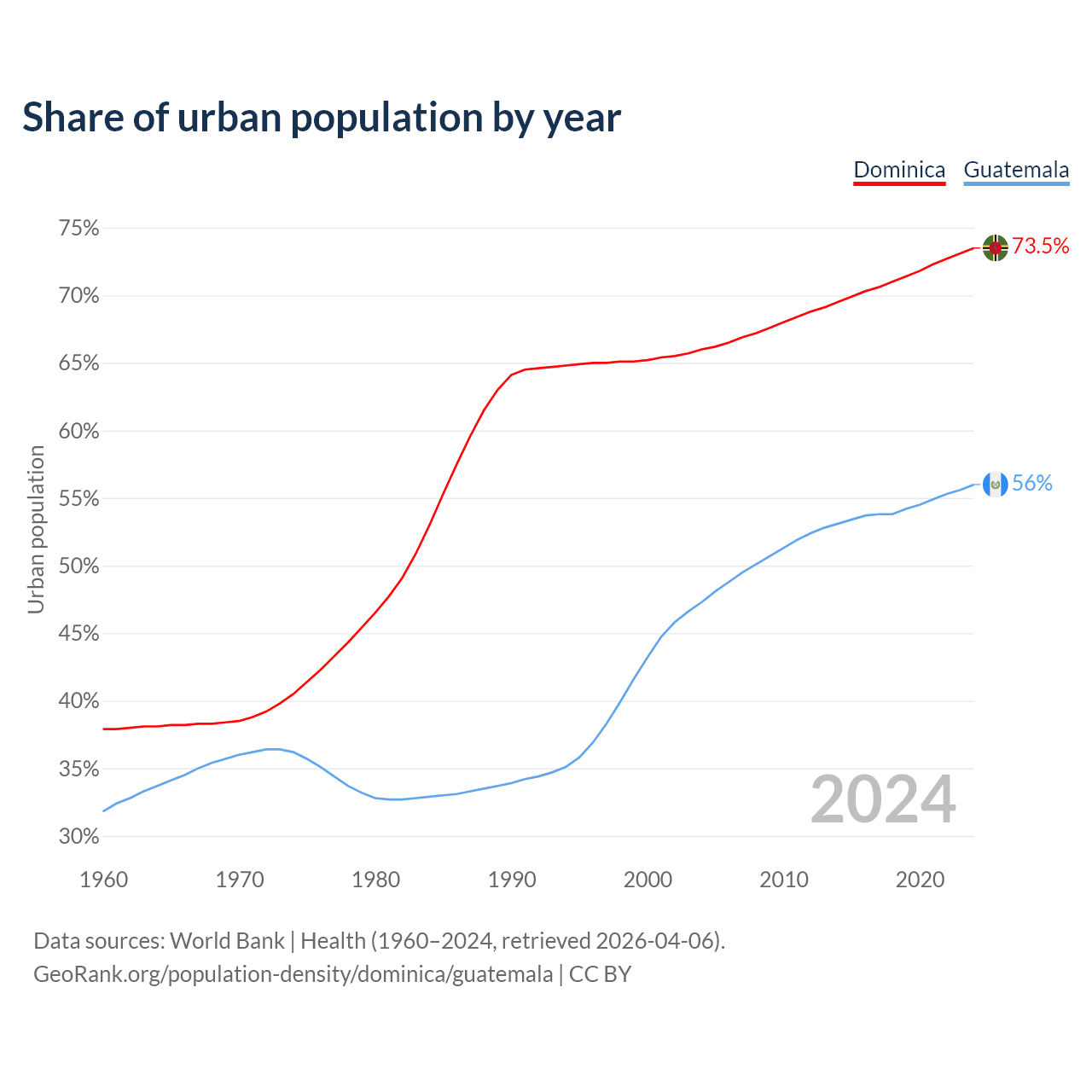 From 2004 to 2024, the share of urban population changed from 66% to 73.5% in Dominica and from 47.3% to 56% in Guatemala.