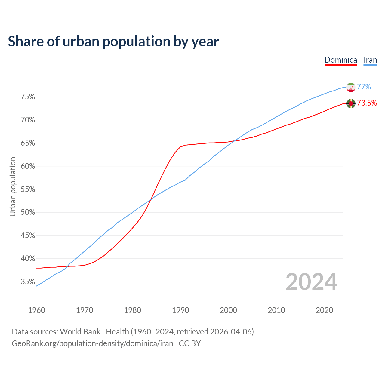 From 2004 to 2024, the share of urban population changed from 66% to 73.5% in Dominica and from 67.3% to 77% in Iran.