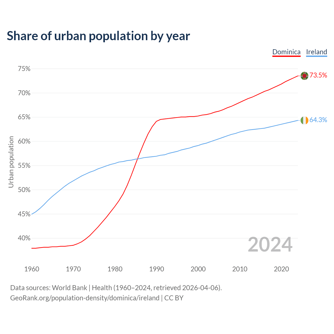 From 2004 to 2024, the share of urban population changed from 66% to 73.5% in Dominica and from 60.2% to 64.3% in Ireland.