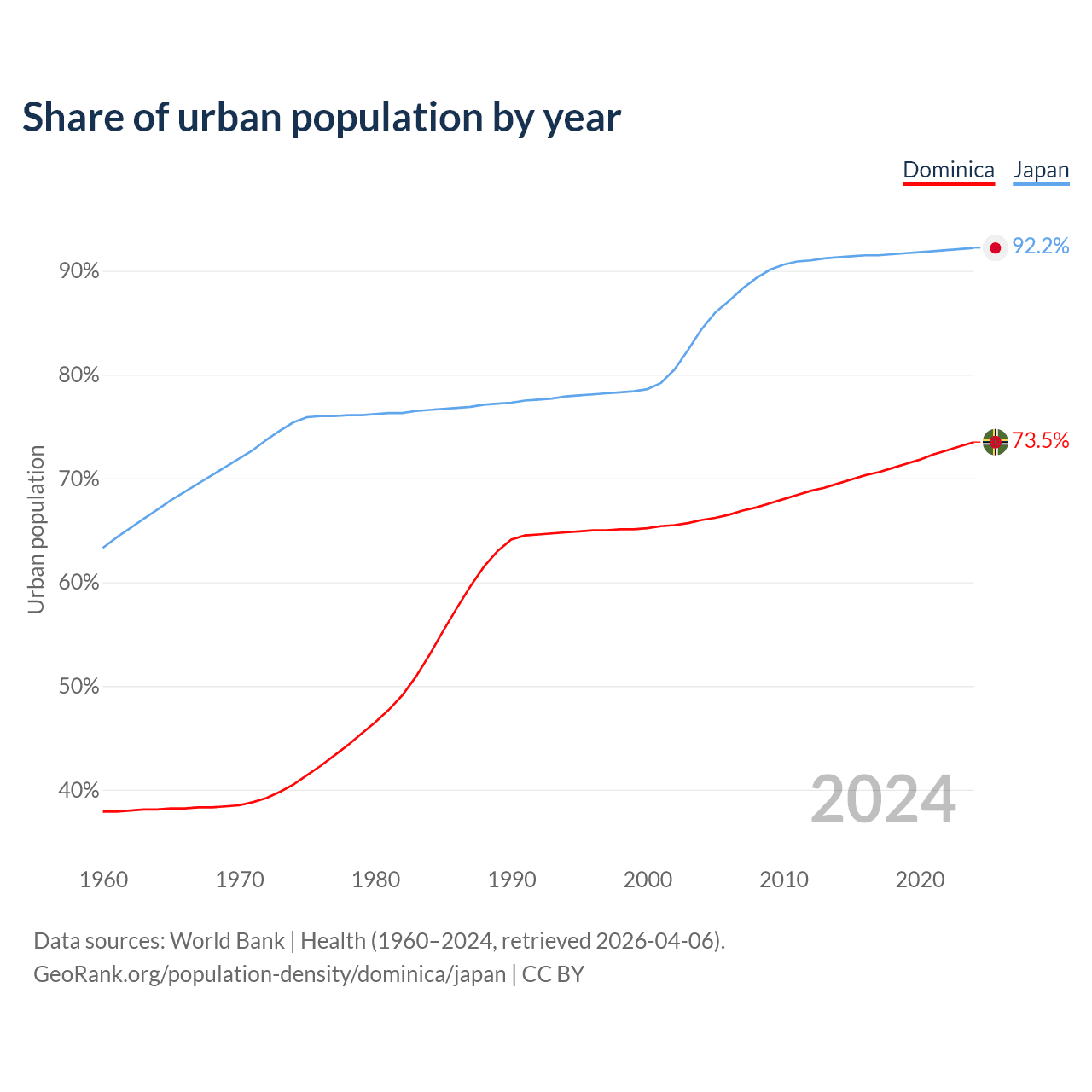 From 2004 to 2024, the share of urban population changed from 66% to 73.5% in Dominica and from 84.4% to 92.2% in Japan.