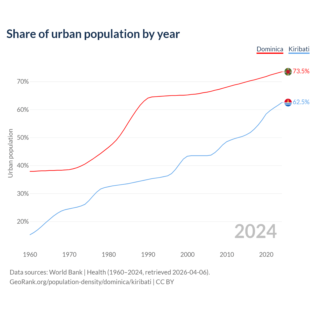 From 2004 to 2024, the share of urban population changed from 66% to 73.5% in Dominica and from 43.5% to 62.5% in Kiribati.