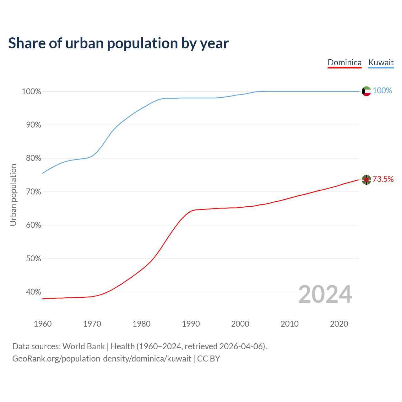 From 2004 to 2024, the share of urban population changed from 66% to 73.5% in Dominica and from 99.9% to 100% in Kuwait.