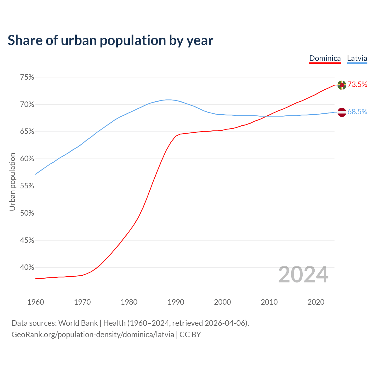 From 2004 to 2024, the share of urban population changed from 66% to 73.5% in Dominica and from 67.9% to 68.5% in Latvia.