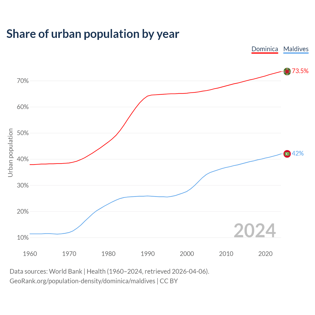 From 2004 to 2024, the share of urban population changed from 66% to 73.5% in Dominica and from 32.9% to 42% in Maldives.