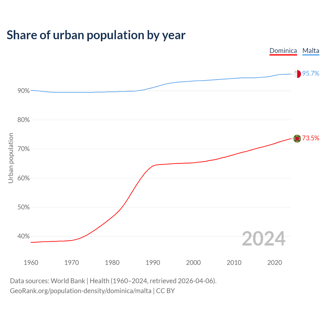 From 2004 to 2024, the share of urban population changed from 66% to 73.5% in Dominica and from 93.6% to 95.7% in Malta.