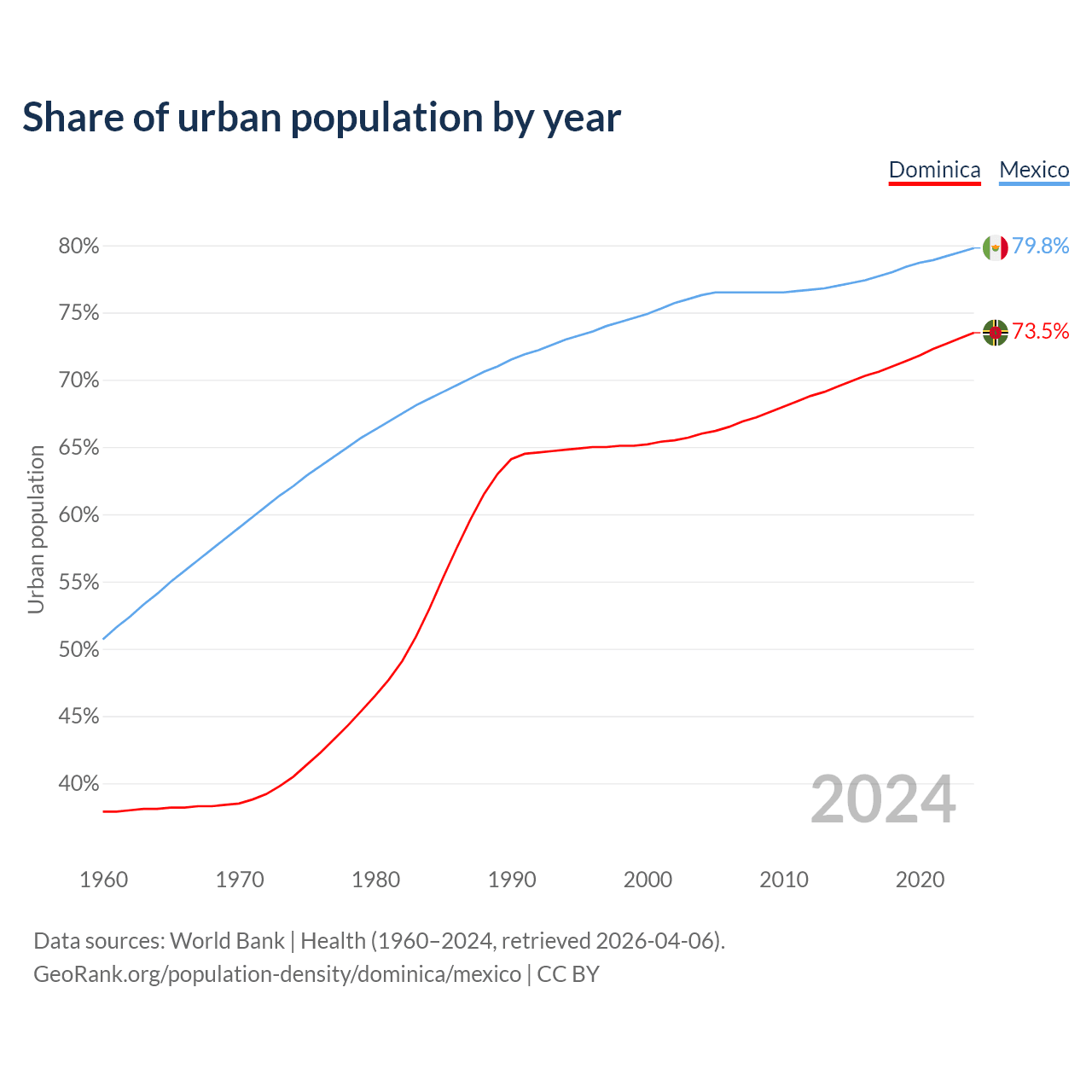 From 2004 to 2024, the share of urban population changed from 66% to 73.5% in Dominica and from 76.3% to 79.8% in Mexico.