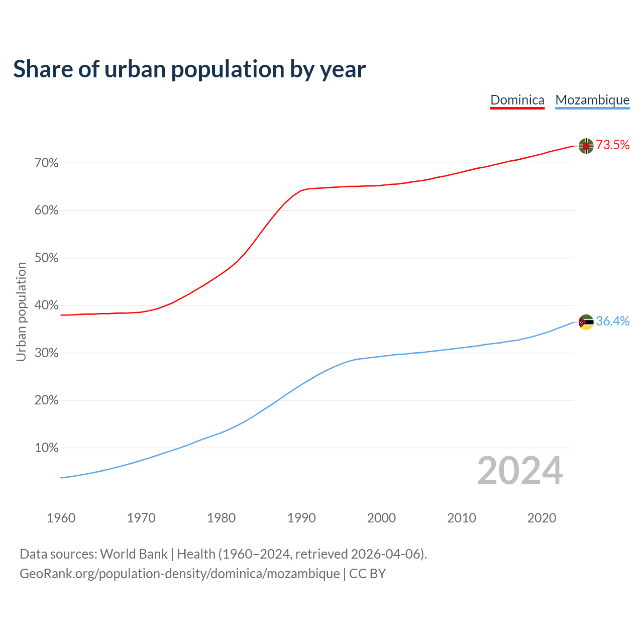 From 2004 to 2024, the share of urban population changed from 66% to 73.5% in Dominica and from 29.9% to 36.4% in Mozambique.