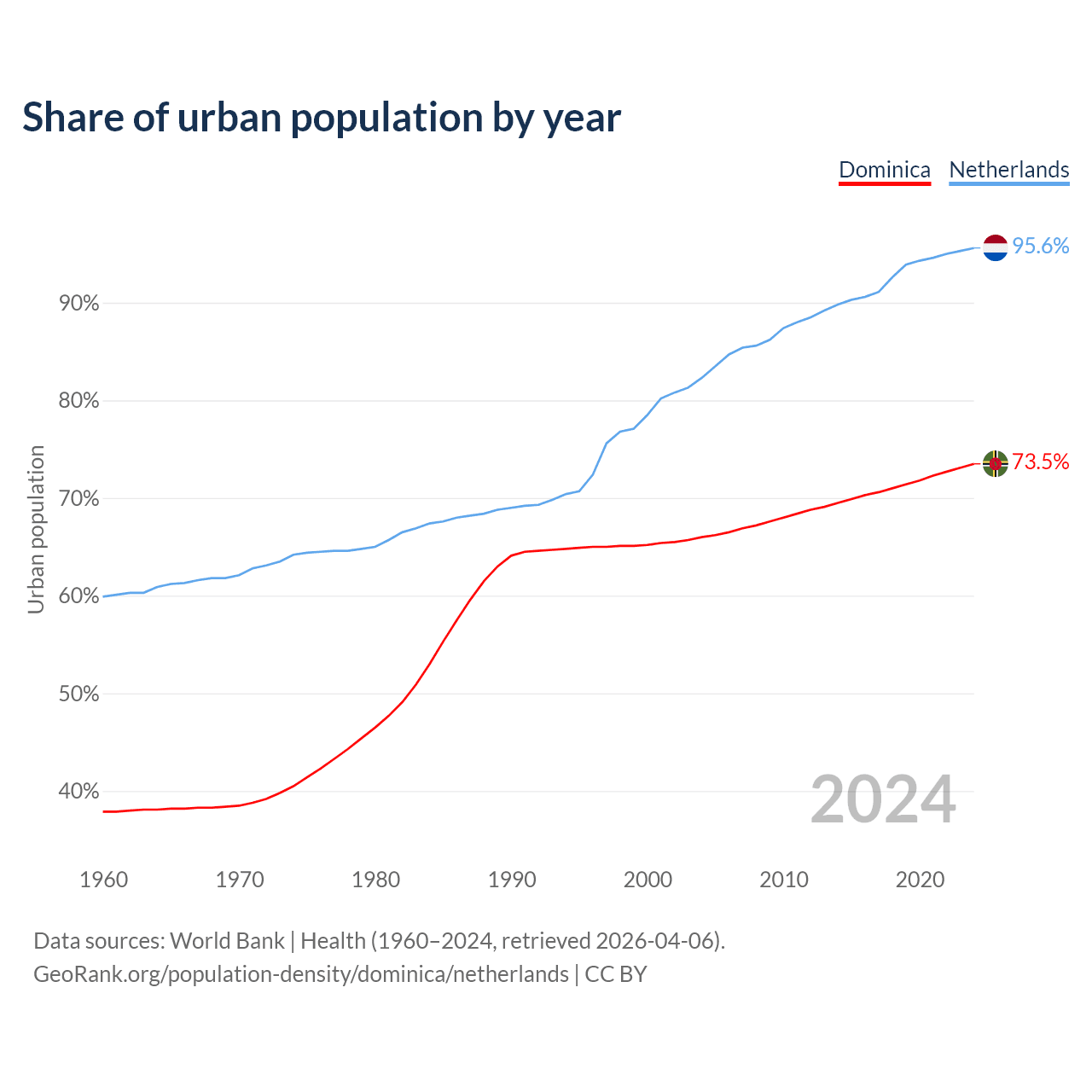 From 2004 to 2024, the share of urban population changed from 66% to 73.5% in Dominica and from 82.3% to 95.6% in the Netherlands.