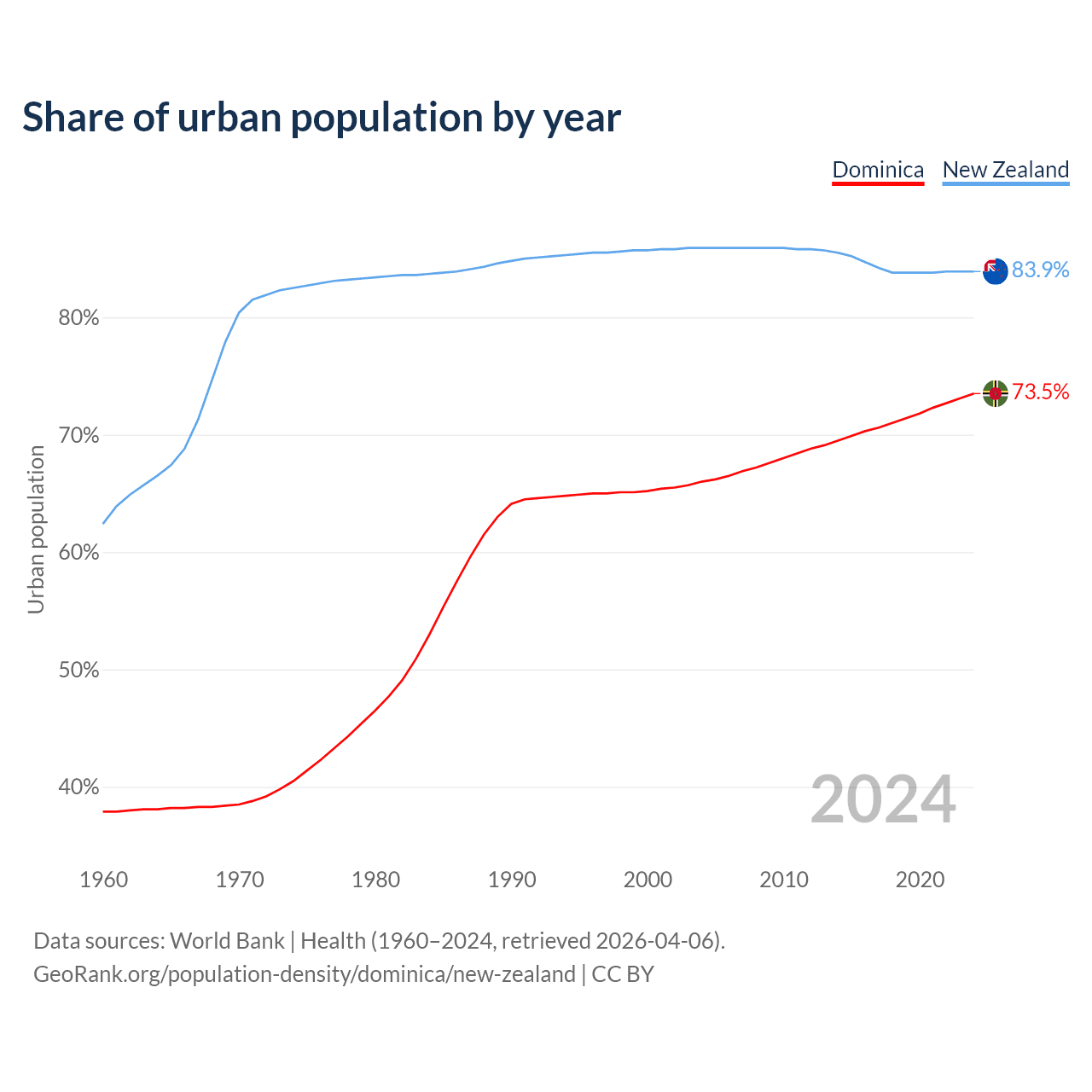 From 2004 to 2024, the share of urban population changed from 66% to 73.5% in Dominica and from 85.9% to 83.9% in New Zealand.