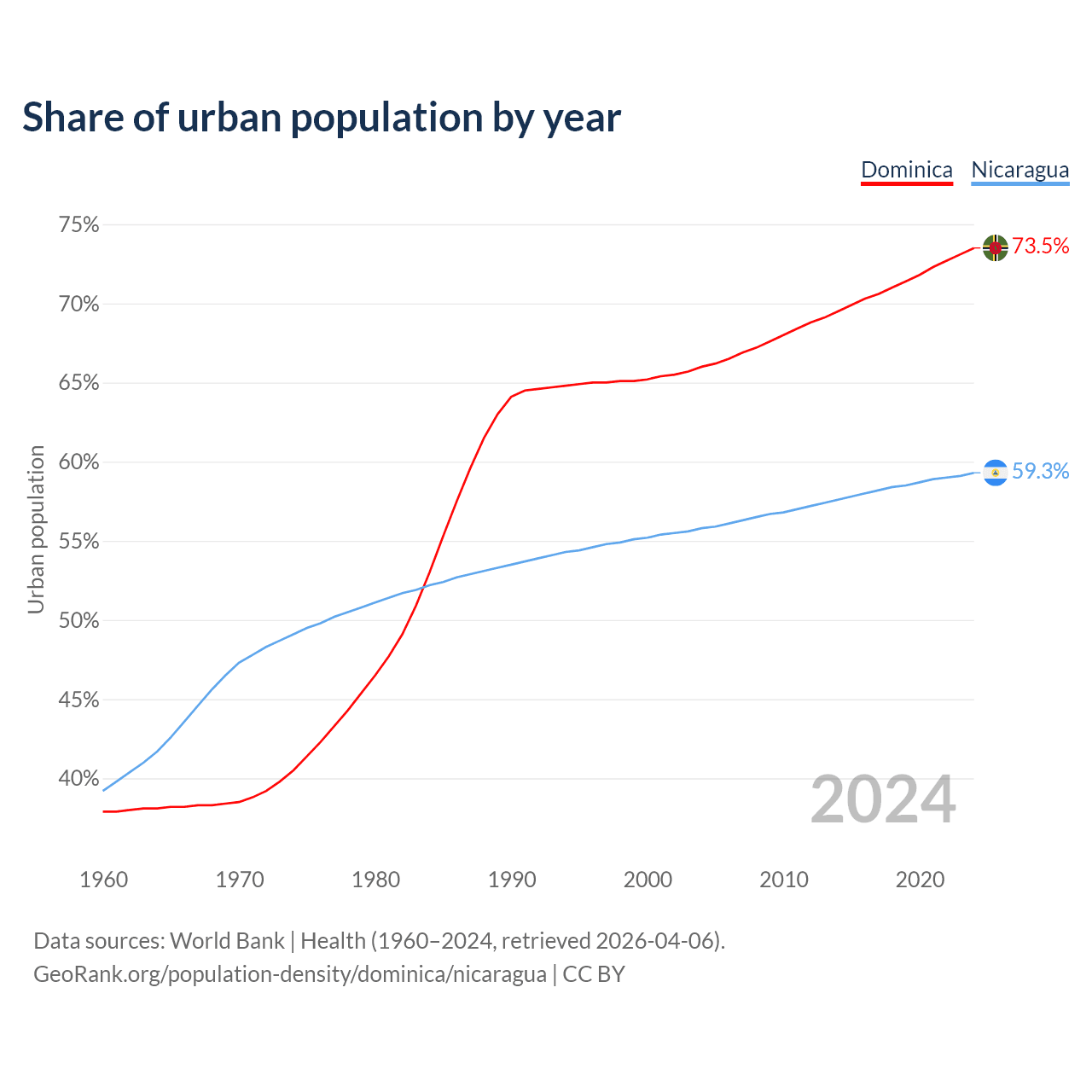 From 2004 to 2024, the share of urban population changed from 66% to 73.5% in Dominica and from 55.8% to 59.3% in Nicaragua.