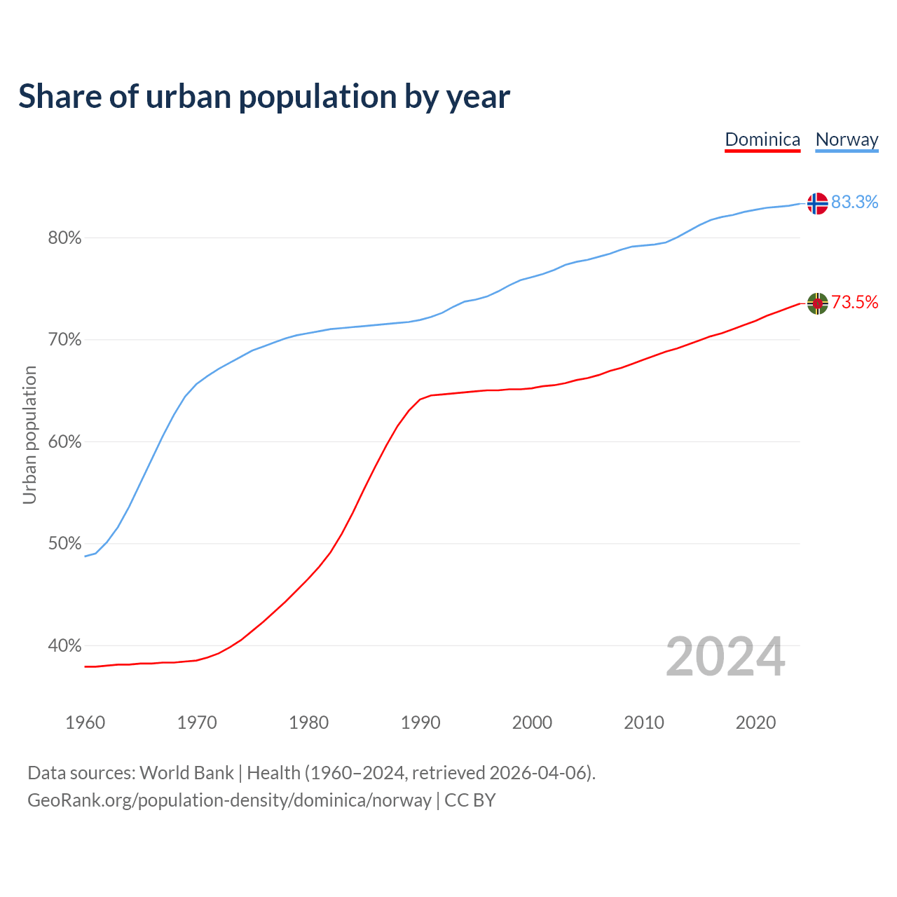 From 2004 to 2024, the share of urban population changed from 66% to 73.5% in Dominica and from 77.6% to 83.3% in Norway.