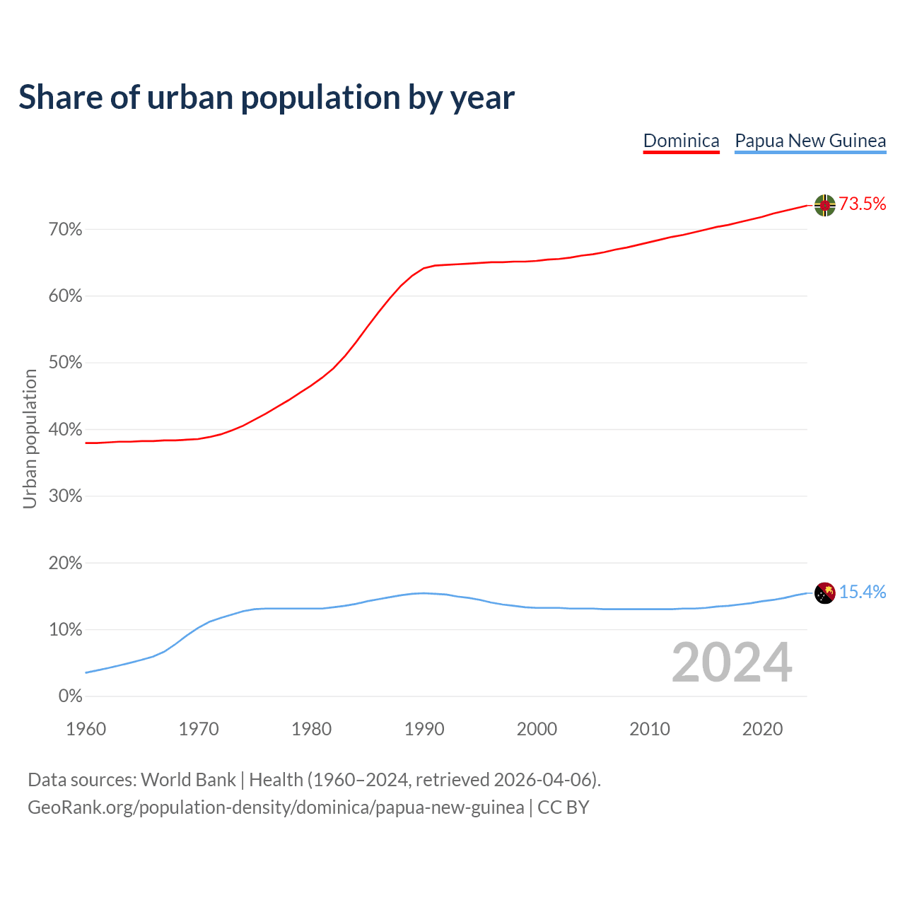From 2004 to 2024, the share of urban population changed from 66% to 73.5% in Dominica and from 13.1% to 15.4% in Papua New Guinea.