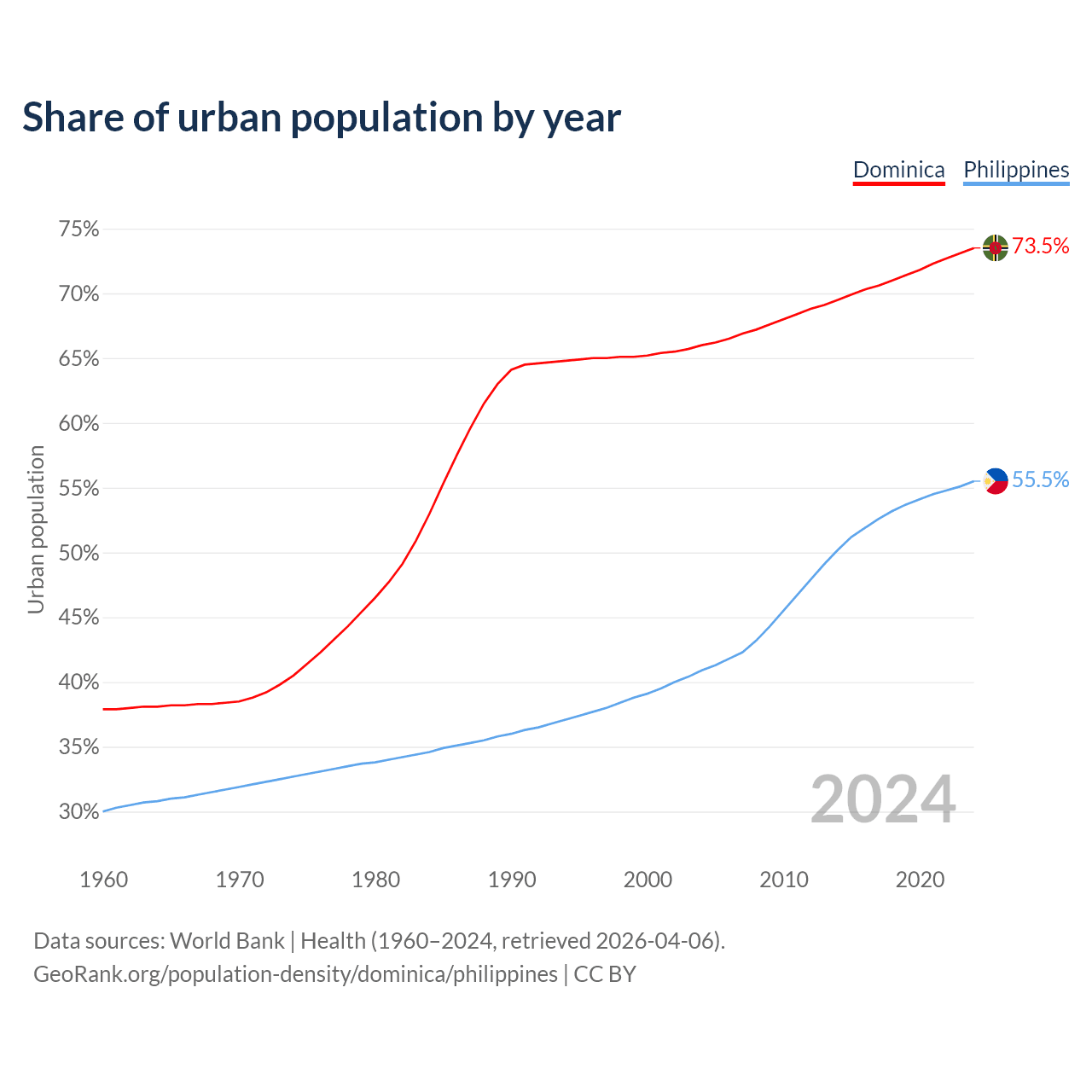 From 2004 to 2024, the share of urban population changed from 66% to 73.5% in Dominica and from 40.9% to 55.5% in the Philippines.