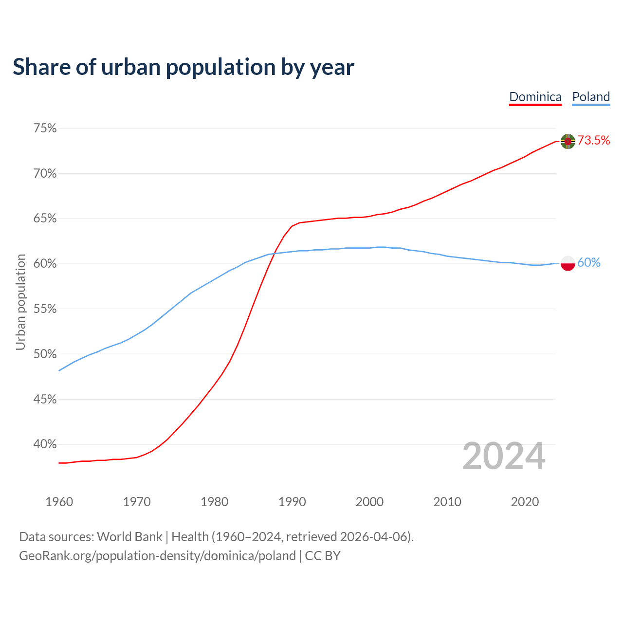 From 2004 to 2024, the share of urban population changed from 66% to 73.5% in Dominica and from 61.7% to 60% in Poland.