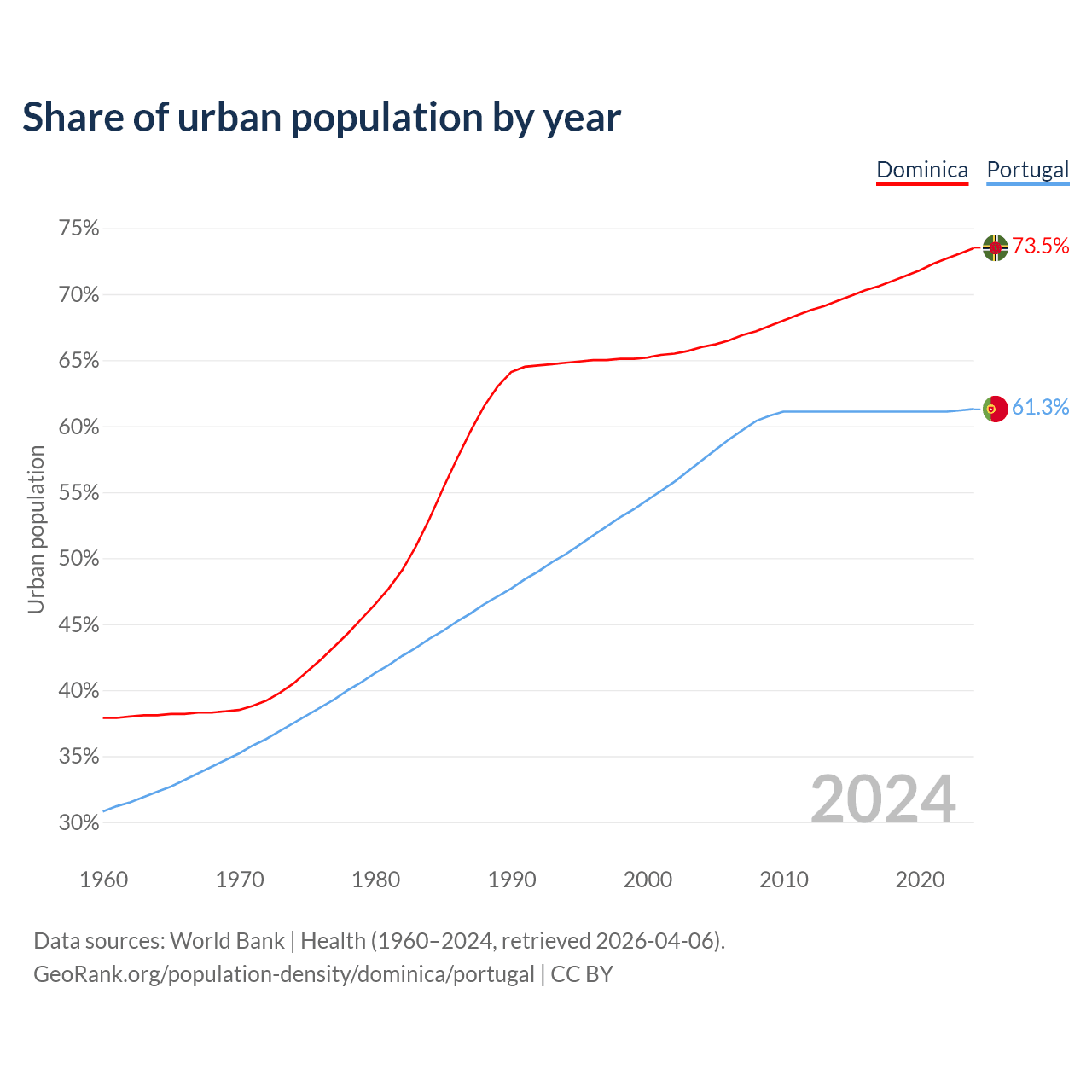 From 2004 to 2024, the share of urban population changed from 66% to 73.5% in Dominica and from 57.4% to 61.3% in Portugal.